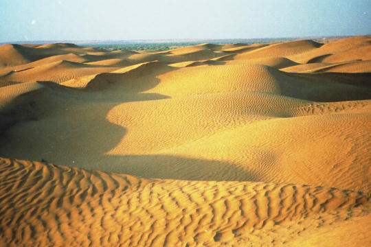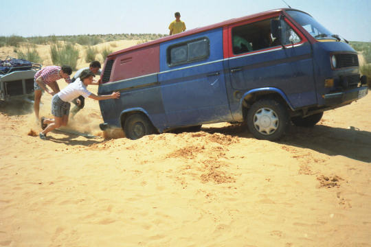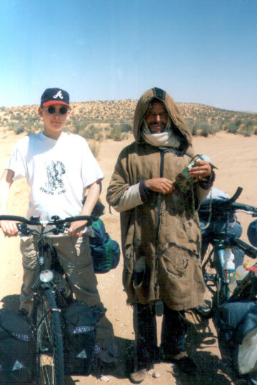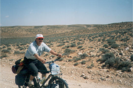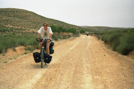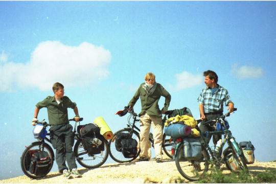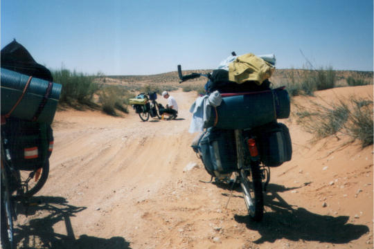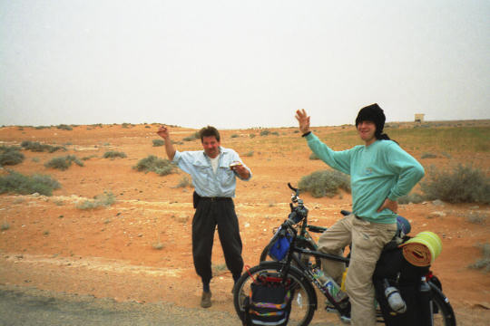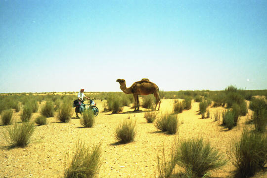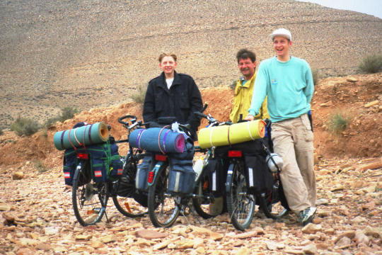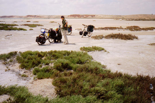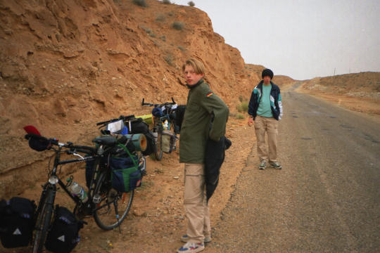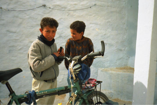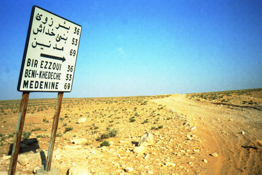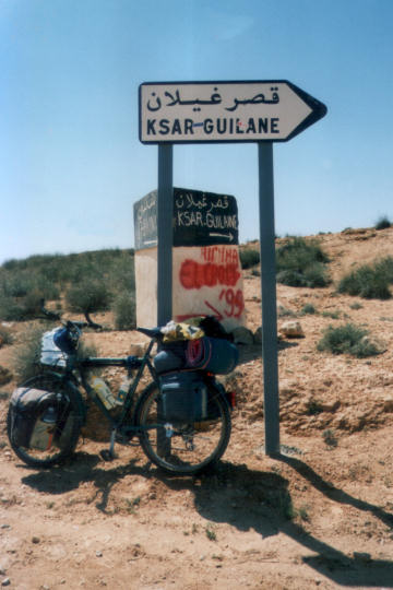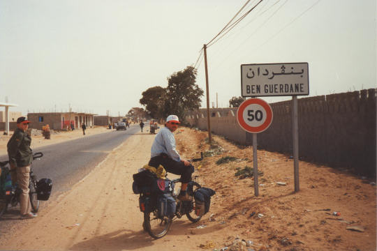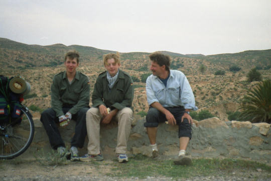 1995 Tunesien 3 vom 3. - 17. April Unsere Tunesienfahrt 1995 führte mich mit meinen beiden Söhnen Arne (17) und Terje (14) von Houmt Souk (Djerba) über Zarzis und Ben Guerdane an der lybischen Grenze nach Tataouine. Die Straßen waren durchgängig asphaltiert und ab Ben Guerdane auch relativ verkehrsarm. Einziges Problem war der Wind. Von Tatouine ging es weiter über Chenini und dann nur noch auf Pisten nach Ksar Ghilane. Von dieser abzuratenden Wüstenoase im Stile Westerlands (Massentourismus, völlig überzogene Preise, Abfallberge vor der Oase – besser einige Kilometer südlich der Oase in den wirklich schönen Dünen campen) radelten wir auf der Piplinepiste gen Norden bis zum Polizeiposten Bir Soltane. Dann nach Osten ins Dahargebirge nach Matmata und über Toujane nach Medenine. Am Ende der Tour erholten wir uns noch einige Tage in der JH von Aghir auf Djerba. Strecke 712 KM, davon ca. 300 KM Piste |